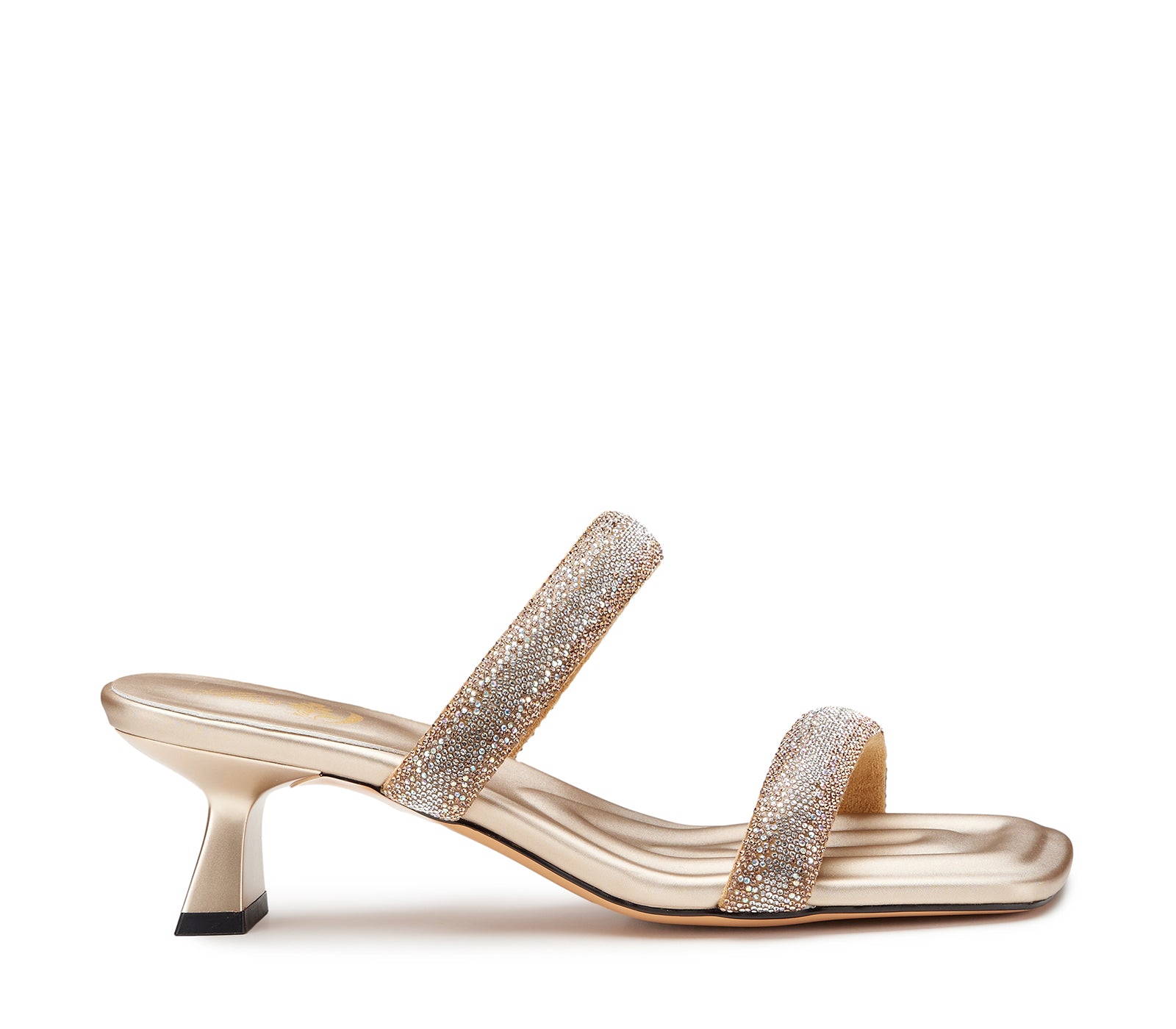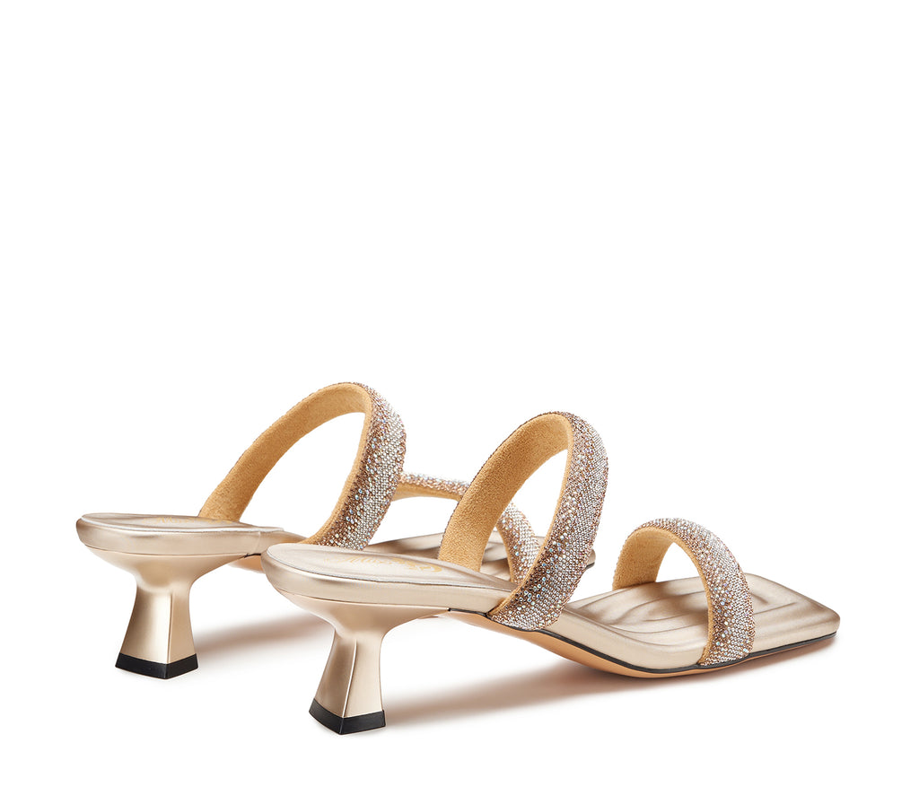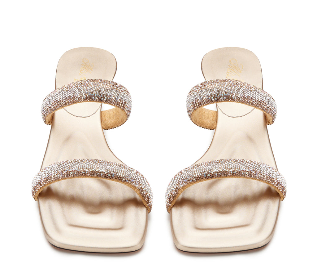 Sandalo in tonalità champagne con punta squadrata e due fasce decorate con strass, disposte parallelamente. Il design essenziale è illuminato dai dettagli scintillanti, ideale per occasioni speciali o per aggiungere eleganza a un outfit quotidiano.