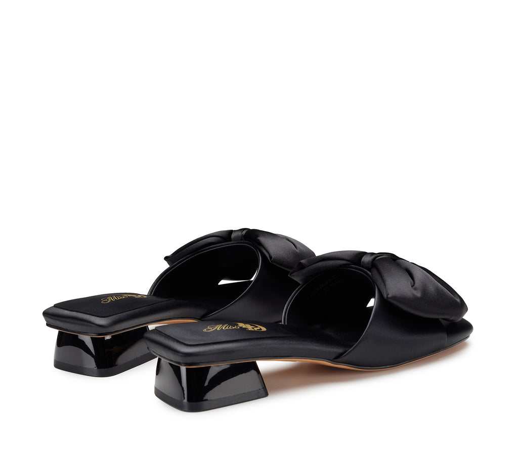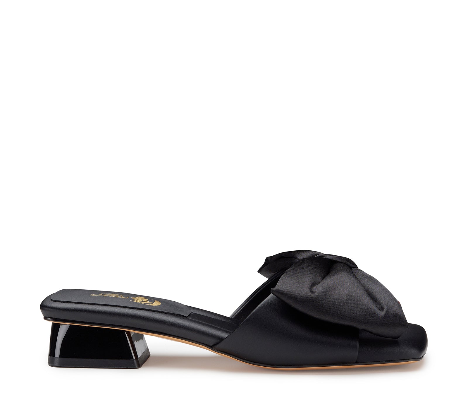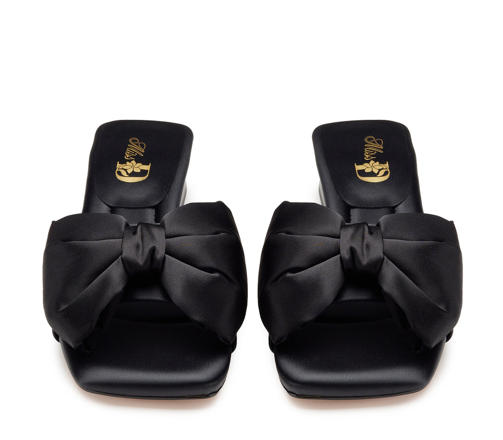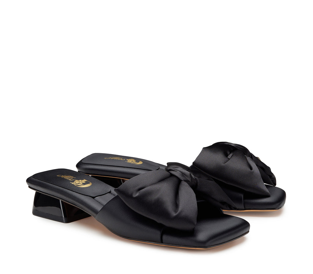 Un sandalo dal design sofisticato in total black, con punta squadrata e un maxi fiocco in raso tono su tono che domina la scena. Elegante e deciso, è l’accessorio perfetto per dare un tocco di charme a un look serale o per completare un outfit total black con un dettaglio di carattere