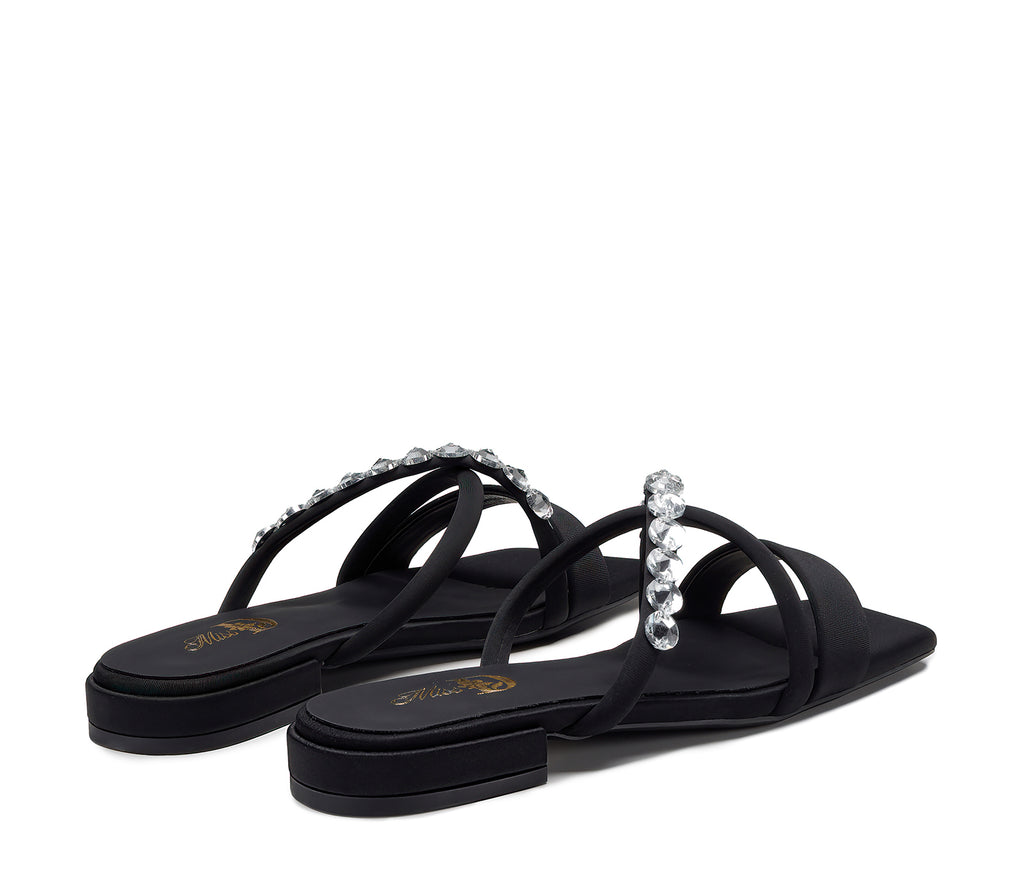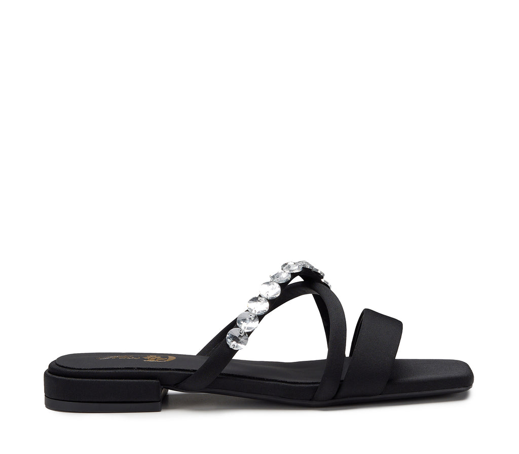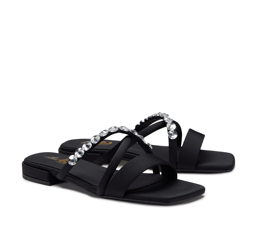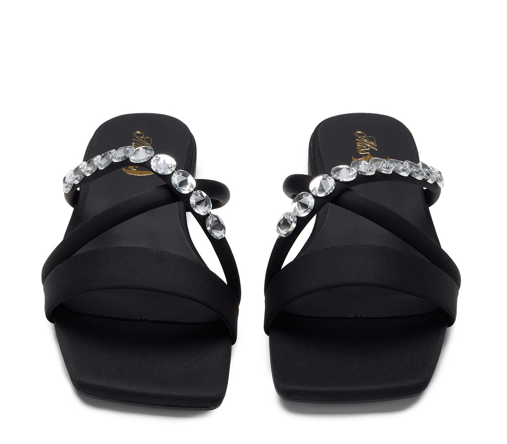 Elegante e contemporaneo, questo sandalo nero si distingue per la sua silhouette essenziale con tre fasce sottili, una delle quali decorata con strass scintillanti. Il contrasto tra il nero opaco e la luce degli strass crea un equilibrio perfetto tra sobrietà e glamour.