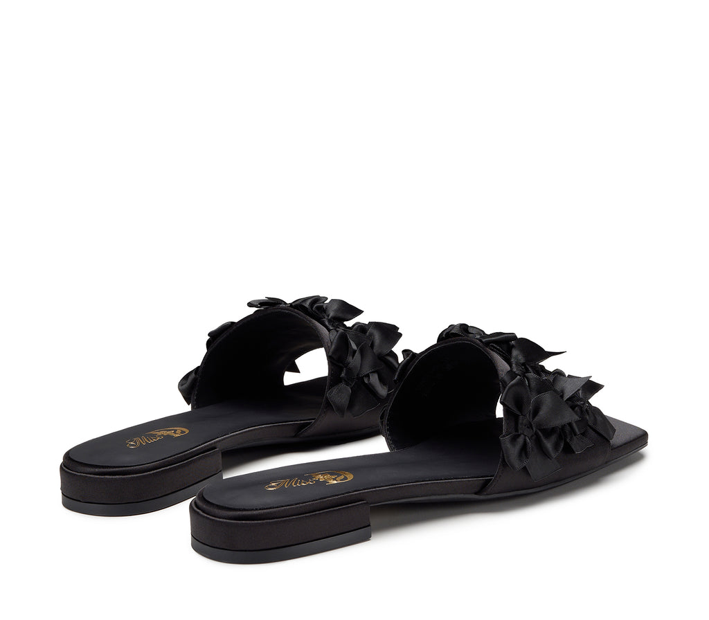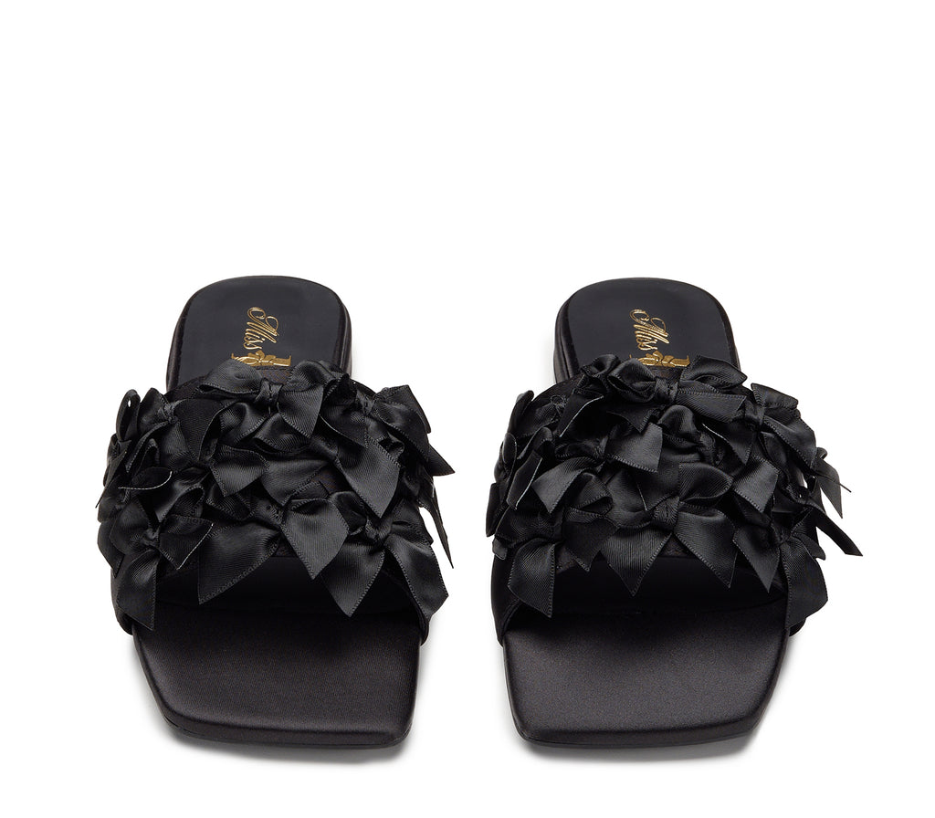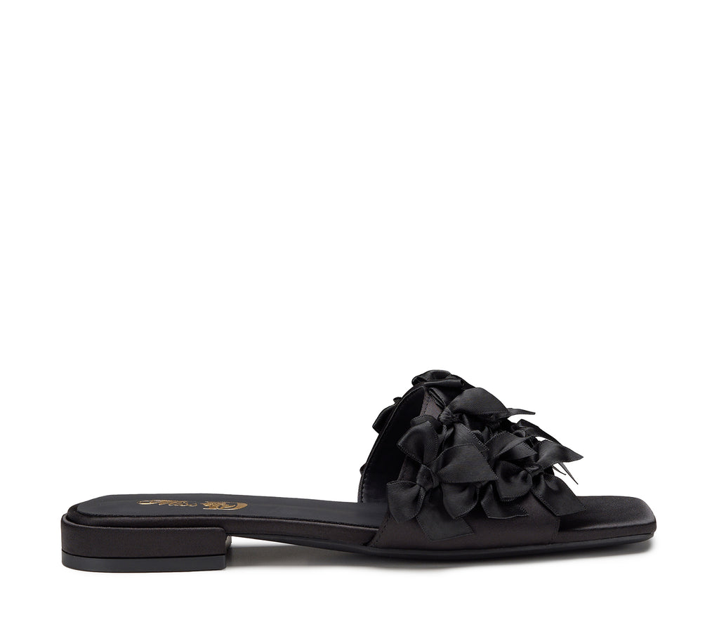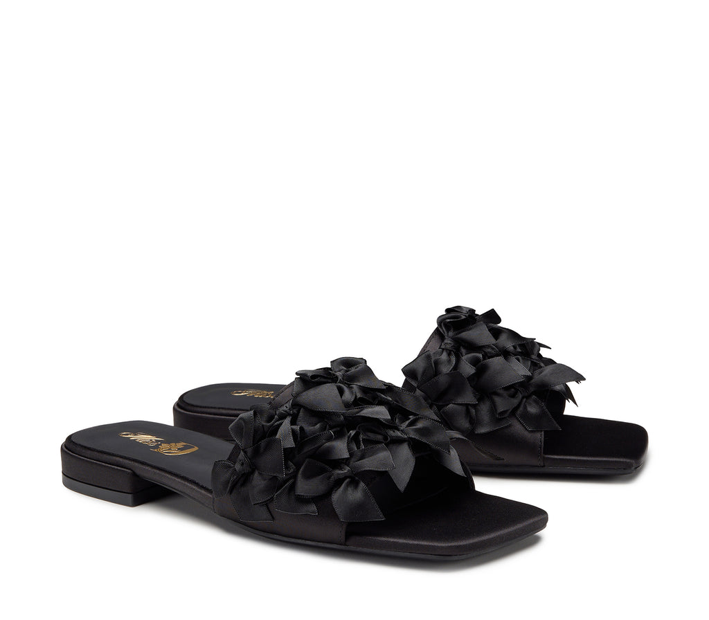 Un sandalo dallo stile teatrale ed elegante, caratterizzato da una base nera con punta squadrata e una decorazione composta da una cascata di piccoli fiocchi tono su tono in tessuto lucido. Un modello che unisce originalità e raffinatezza, perfetto per chi ama osare con classe.