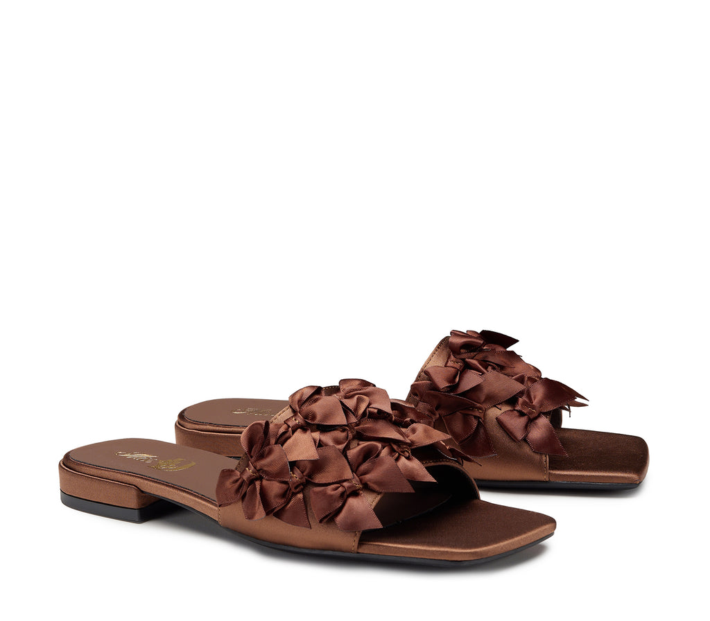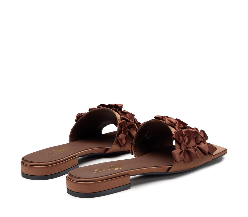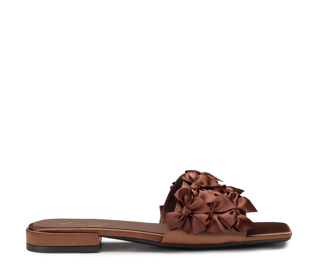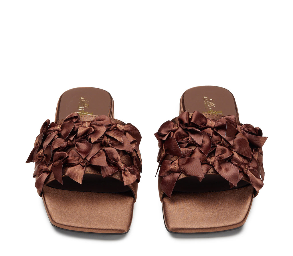 Questo sandalo in tonalità bronzo conquista con la sua texture luminosa e la decorazione in fiocchi satinati tono su tono. La punta squadrata e il gioco di volumi donano carattere e movimento al modello, rendendolo l’alleato ideale per serate speciali o eventi in cui ogni dettaglio fa la differenza.