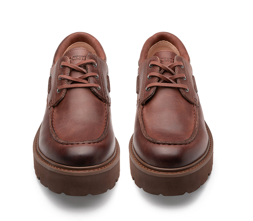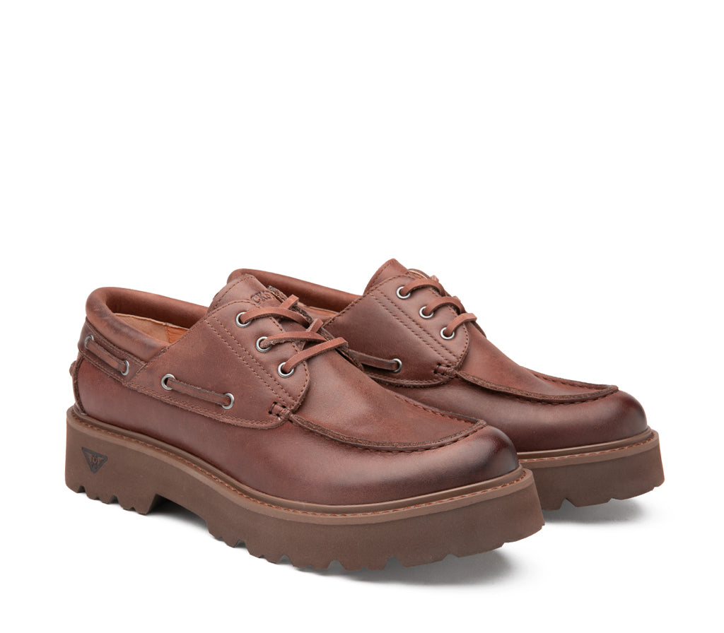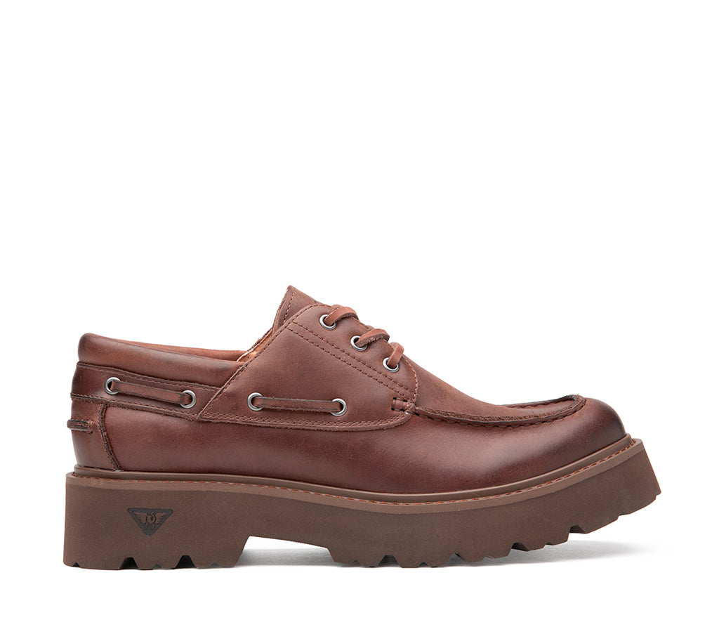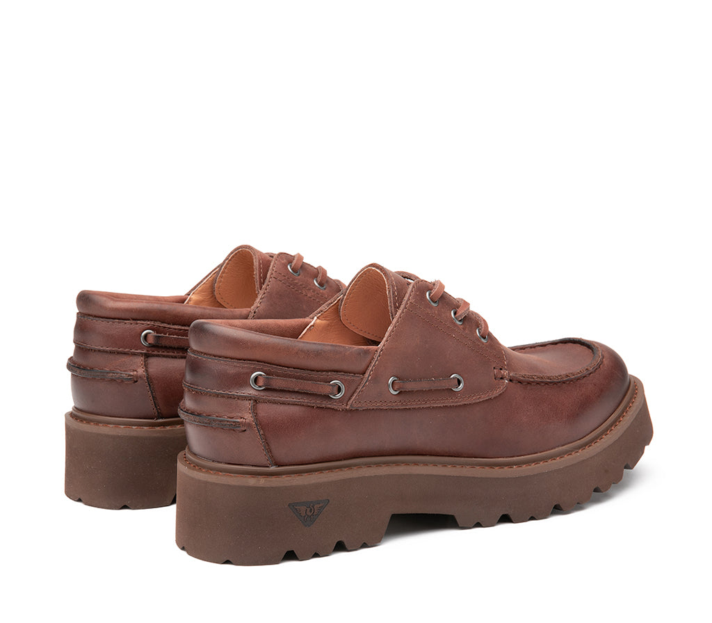 Scarpa da barca con anima metropolitana in marrone, elegante e versatile. La suola carrarmato e il tacco medio offrono stabilità e comodità, mentre il design contemporaneo mantiene un'estetica raffinata. Ideale per chi desidera uno stile formale-casual equilibrato, dove la sobrietà incontra un'impronta di personalità distintiva.