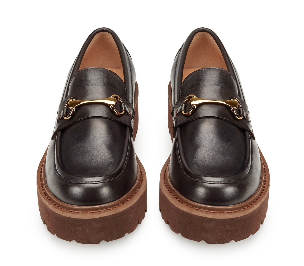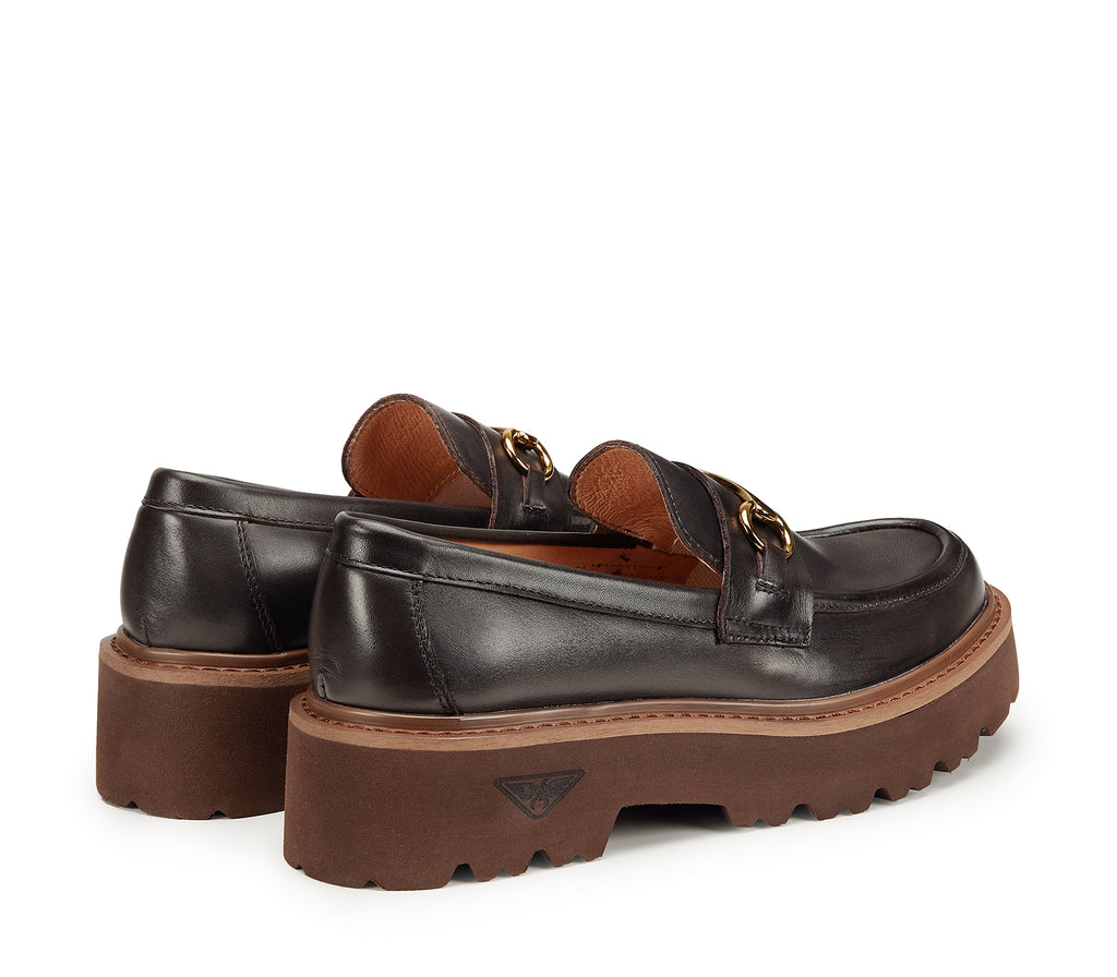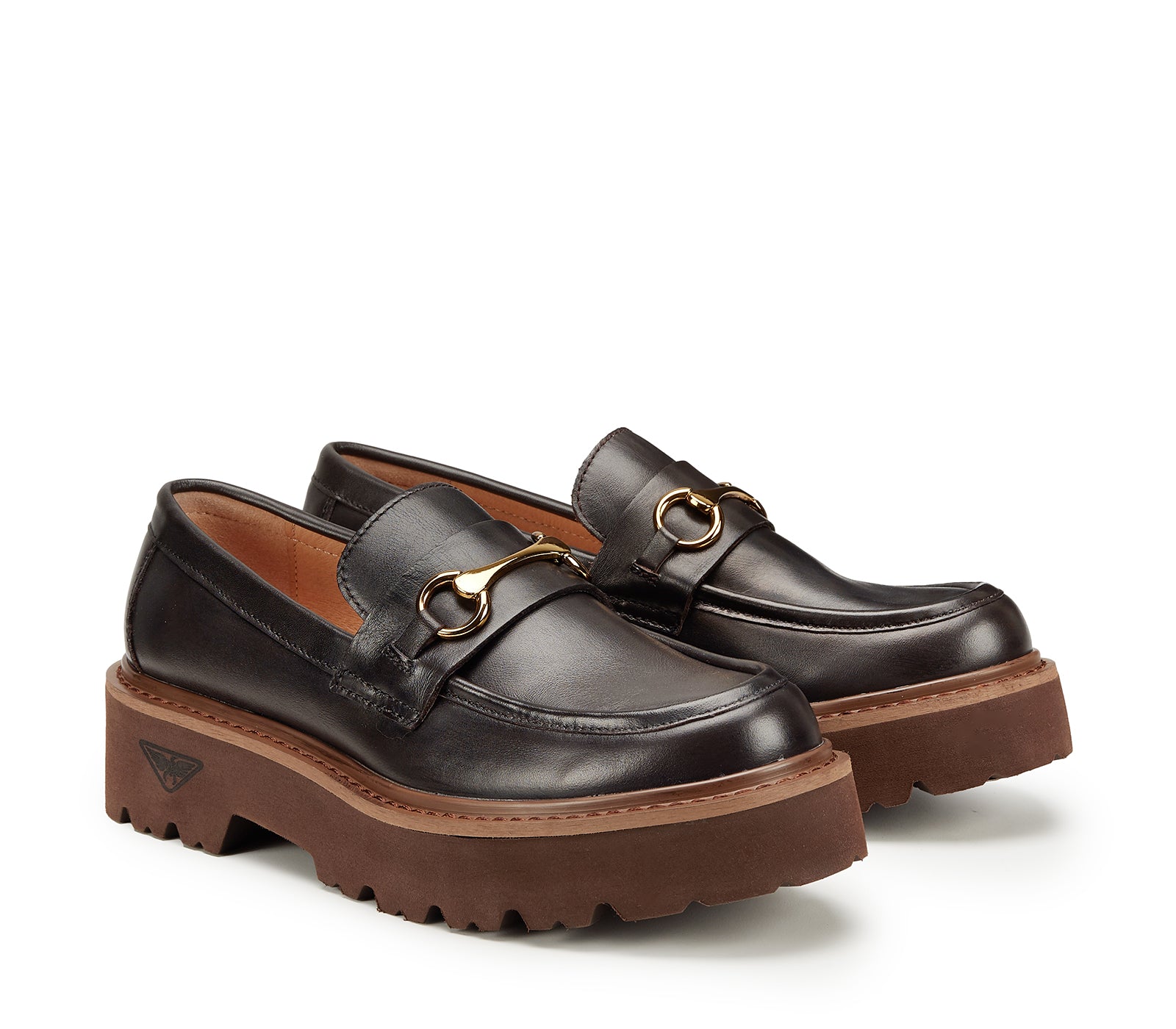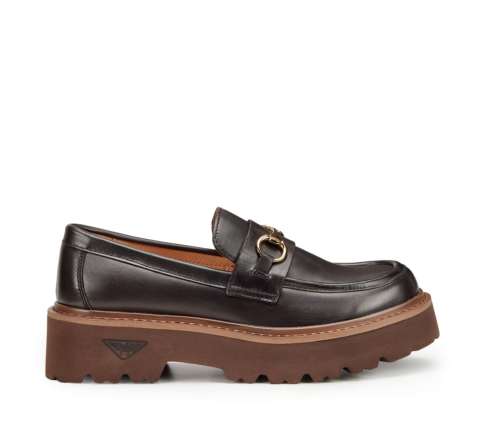 I mocassini da donna di Docksteps hanno il DNA per il business e sono perfetti sia per l’ufficio che per il tempo libero. Realizzati in elegante pelle marrone, poggiano su una suola a contrasto extra light personalizzata con il monogramma del brand. Un raffinato passe-partout urbano, adornato dall'accessorio catena in metallo d'orato.
