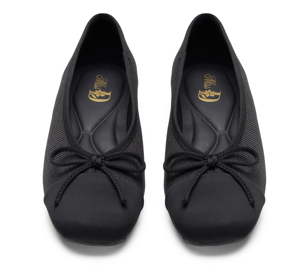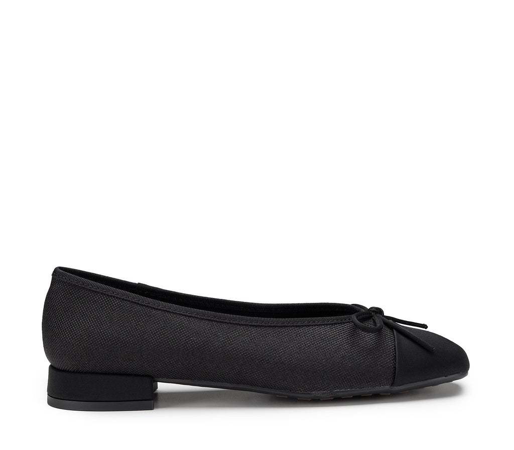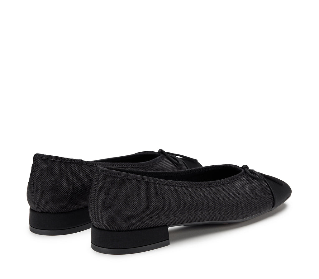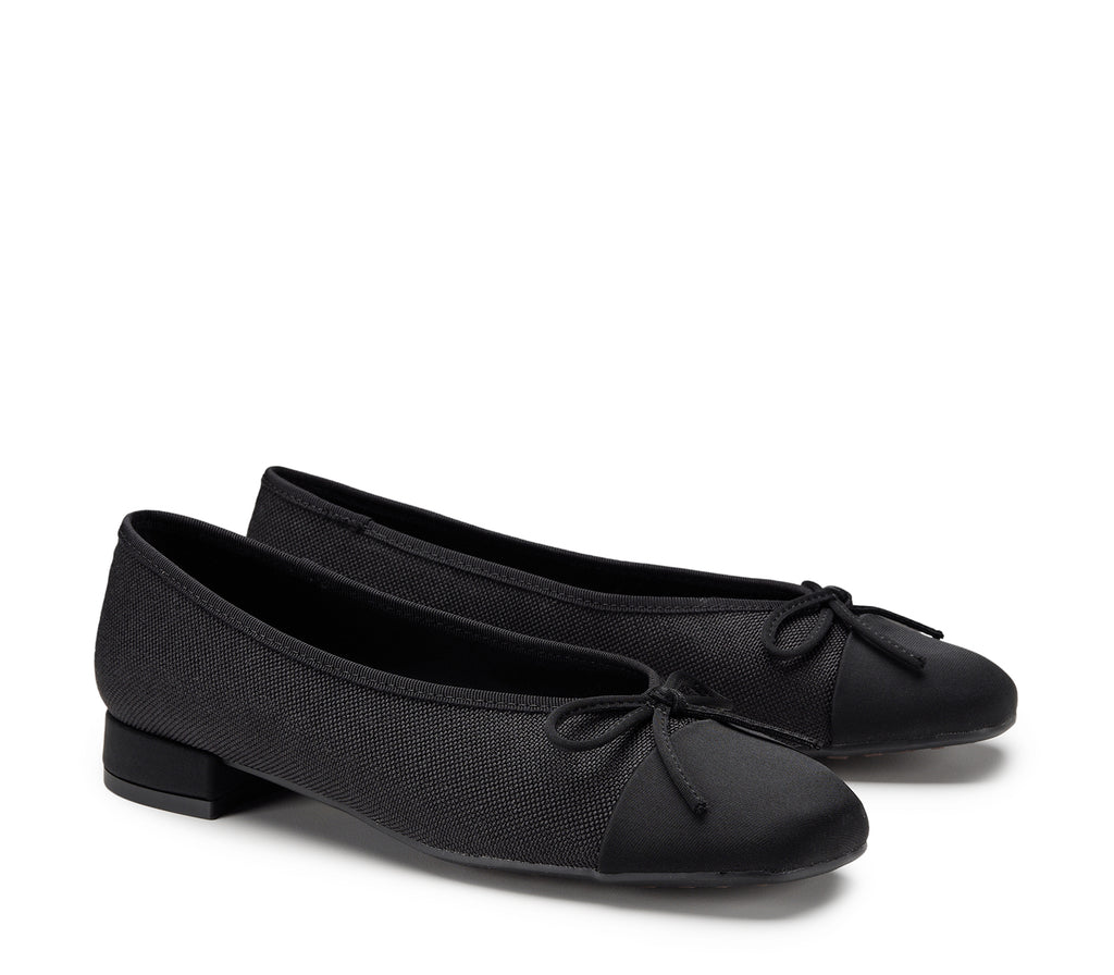 Un modello classico rivisitato in chiave contemporanea: questa ballerina total black con tacco basso unisce la praticità al carattere deciso, grazie anche al piccolo fiocco decorativo in punta che dona un tocco di eleganza parigina, perfetta per look urbani dallo spirito indipendente.